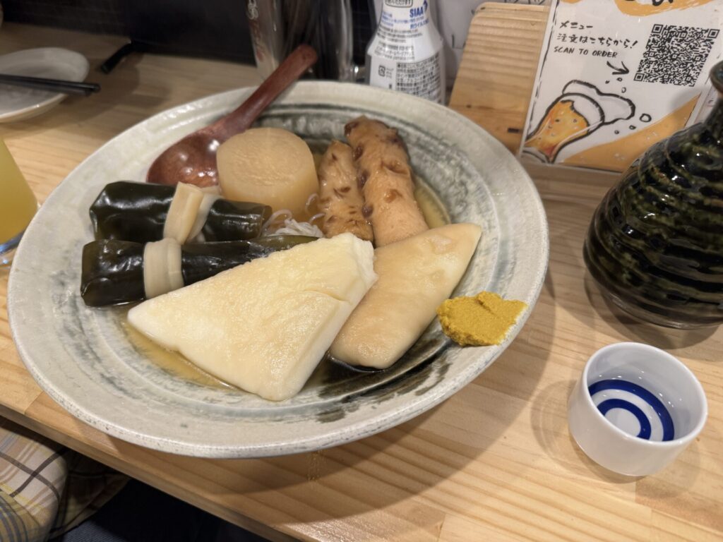 お酒は辰野の銘酒「夜明け前」とおでんに山賊焼きと堪能しました。