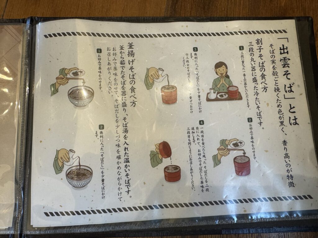 そばの食べ方がかいてあります。お店の方に出雲そばといえば温かいのと冷たいのとどんな食べ方が多いのですかときくと割子そばを食べる人が多いとのことで割子そばを注文です。