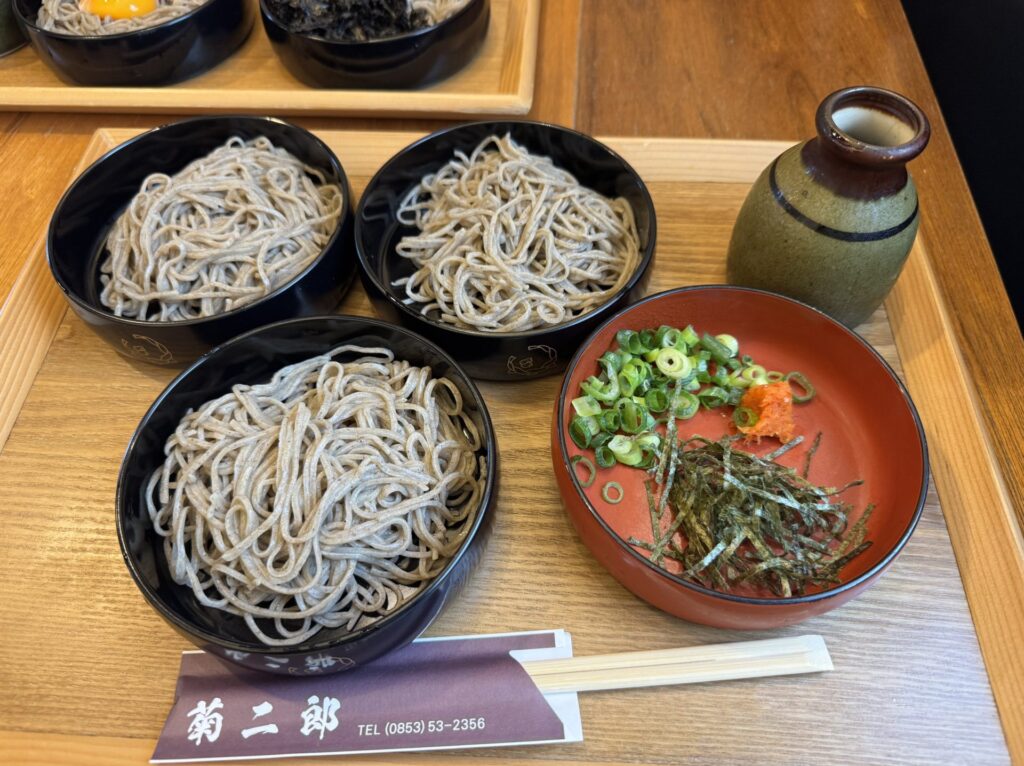 割子そばです。お椀3つに分けてでてきます。長野は一つのお皿に出てきますがわんこそばはたくさんのお椀で出てきます。出雲そばは3つのお椀で出てきました。
