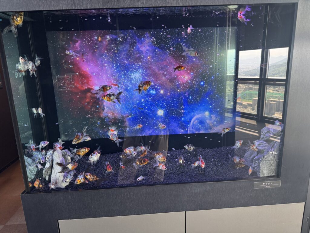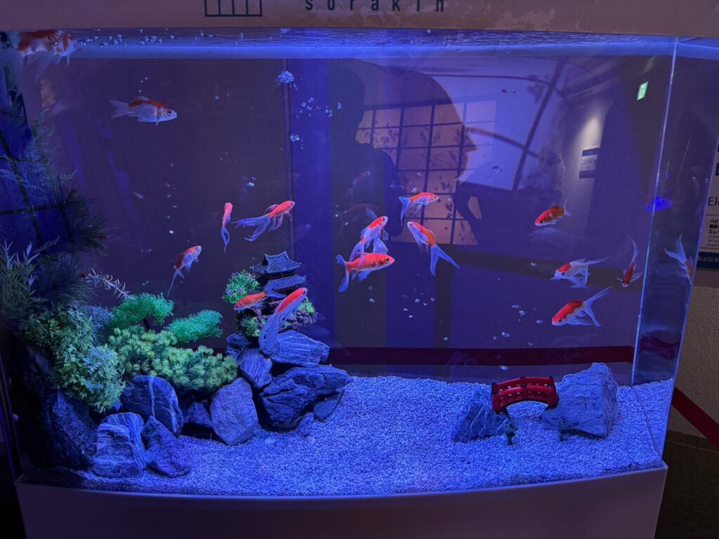 エレベーター前の部屋は暗くなっていて部屋の中心に金魚が泳いでいます。エレベーターを待っている間も金魚が楽しめるようになっています。