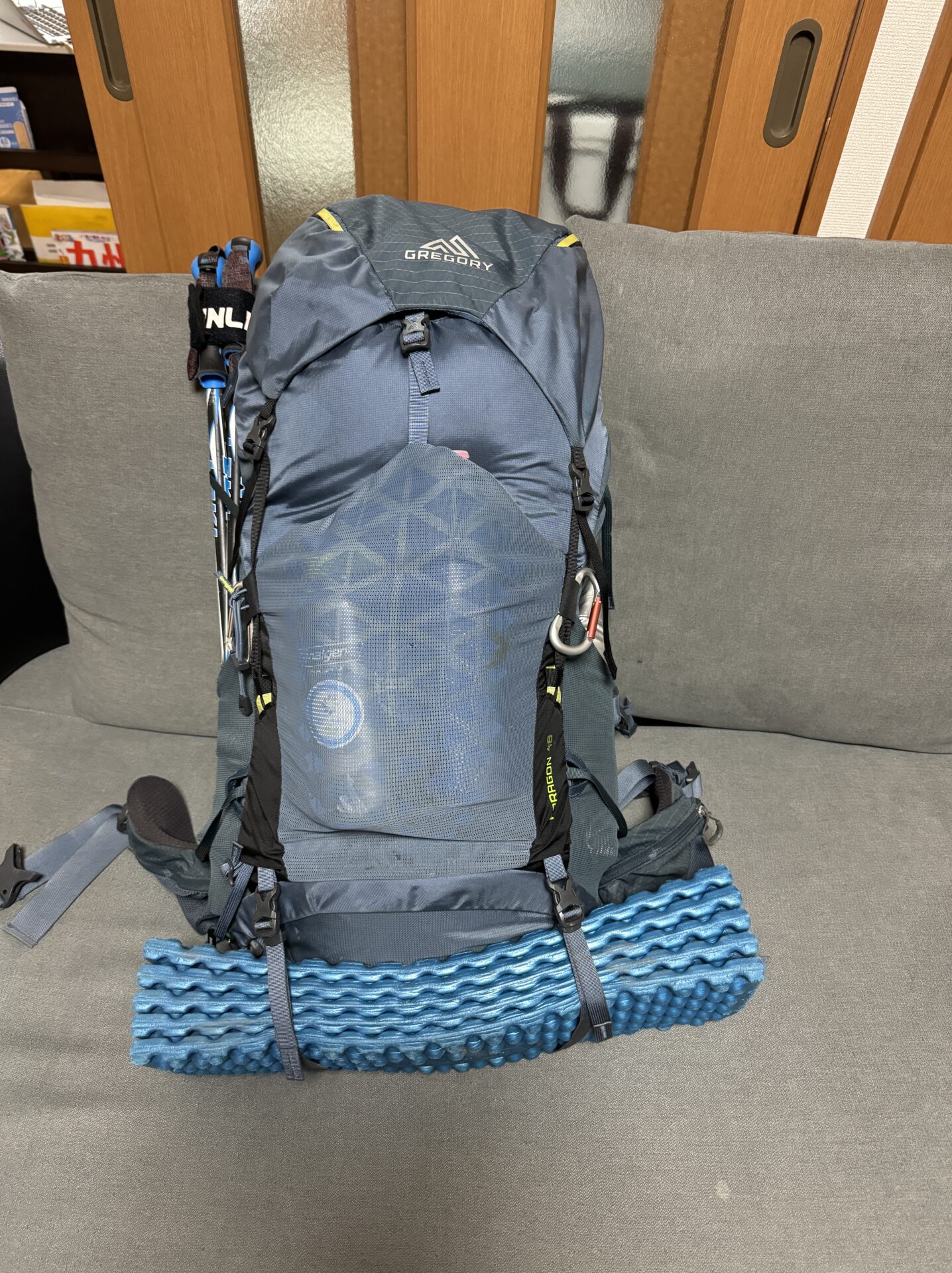 ザックはグレゴリーのパラゴン48リットルを使用しています。購入時にネットとかの情報で色々調べましたがこれがいいように思いました。テント泊は最大2泊くらいを想定しています。60リットルとかのザックだと余計なものを入れて重くなるので50リットルほどが最適と思いました。パックの仕方はよく見るユーチューバーの動画を参考に、テントや寝袋は収納袋に入れずにそのまま入れて隙間をなくすようにしています。荷物は一番下にテントをそのまま入れてます。途中で干したりするときも底から取り出せます。テントの上にクッカーやガスなどの調理用器具を入れてます。基本テント場で出すものなので奥に入れてます。テント場で食べる色も同様に入れます。その上に寝袋を収納袋に入れず入れてます。あと着替えや防寒着も必要最低限にして入れます。寝袋の上に行動食を入れて移動中でも取り出しやすくしています。カッパは天袋に収納していつでも取り出しやすいようにしています。ザックのポケットには、トレッキングポール・水筒・傘を入れておりサコッシュにスマホとバンドエイドを入れています。こんな感じで重さはどれくらいなんだろうと測ってみました。